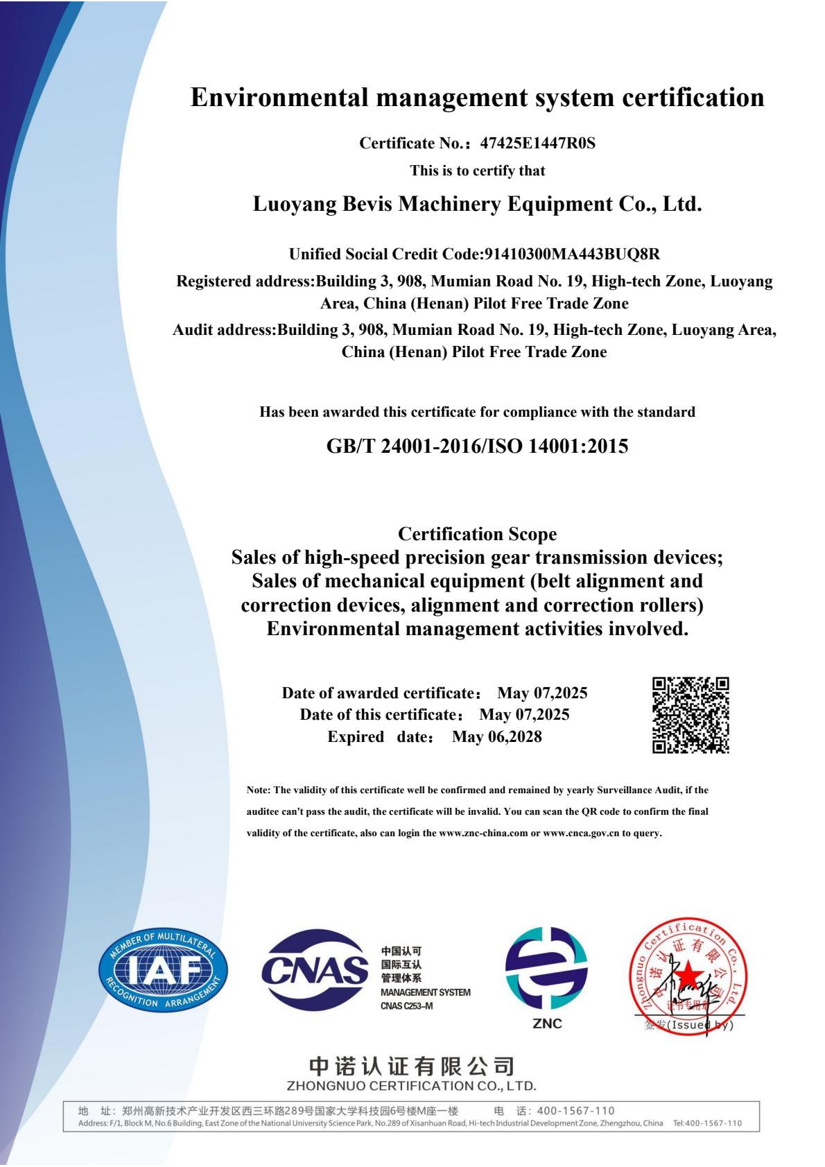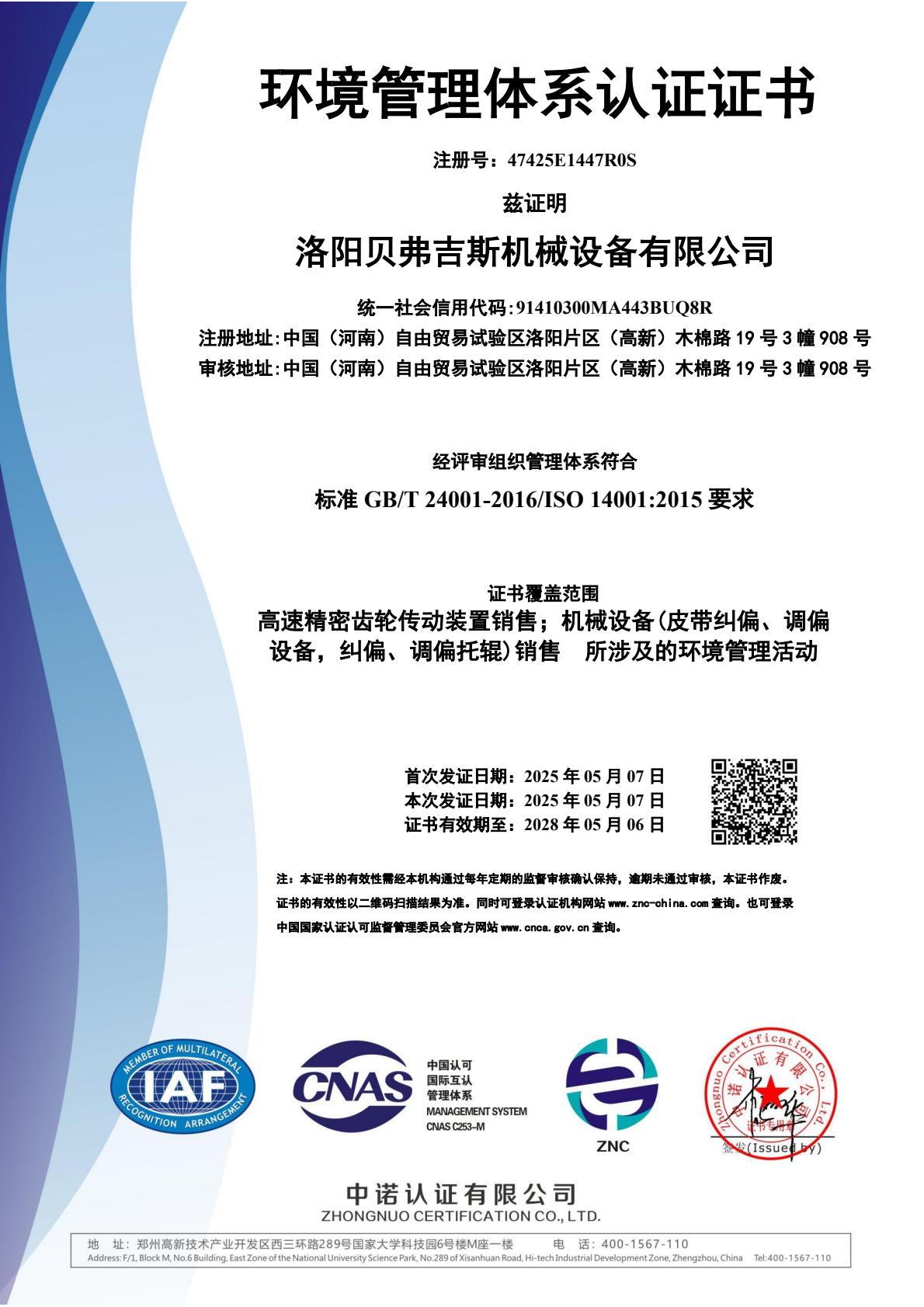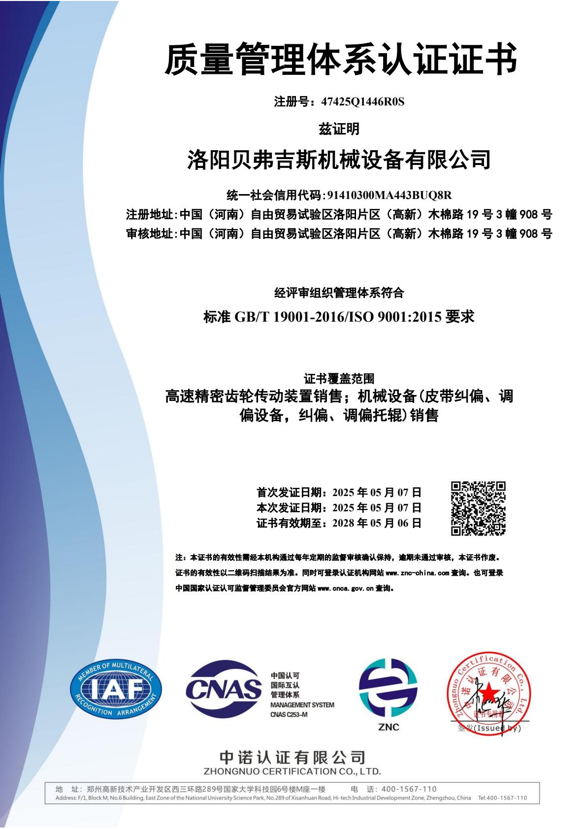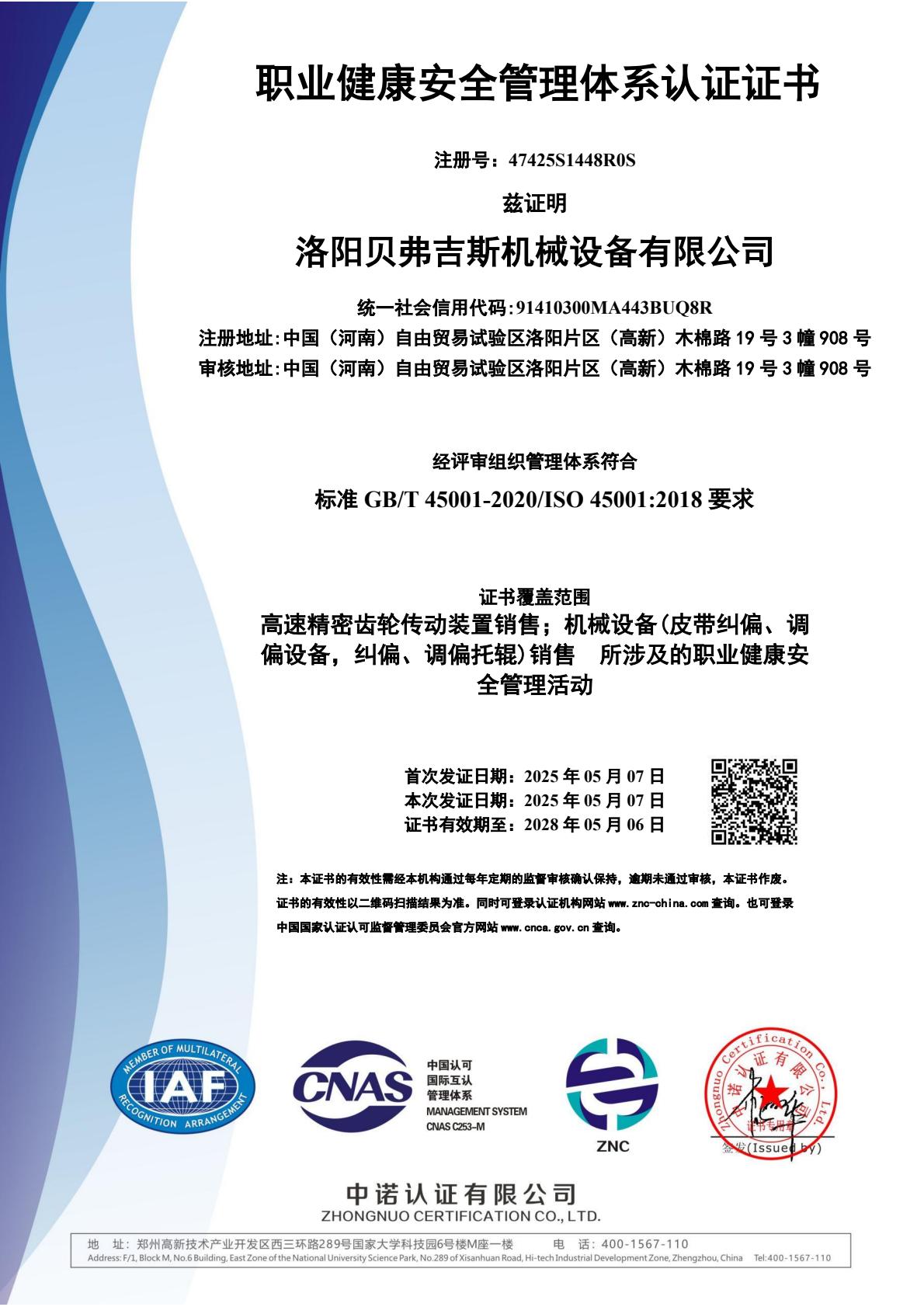 洛阳贝弗吉斯机械设备有限公司三体认证